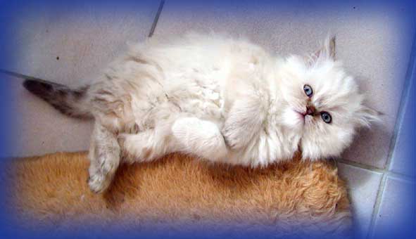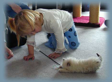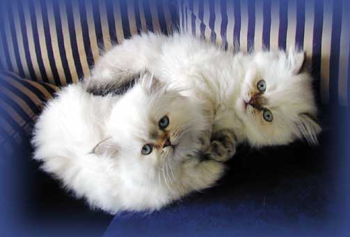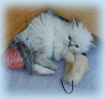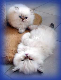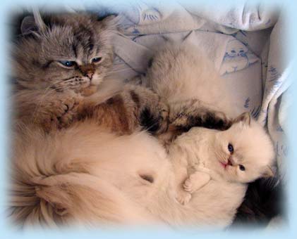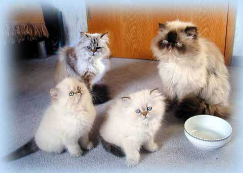 Familienfoto: hinten links Mutter Shushinah - Vater Fussel´s One vorn die beiden Racker. Sie sind jetzt sehr verspielt und gedeihen prächtig. Wir werden wahrscheinlich das Mädchen selbst behalten und das Katerchen abgeben. Es ist noch zu haben. |